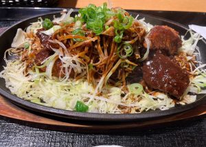 キャベツたっぷり、鉄板でしんなりしててタレと絡めて食べるとすごくいい!