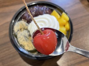 見た目華やか。定番のさくらんぼが入っていて、わらび餅は2個も入ってる。