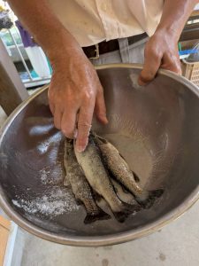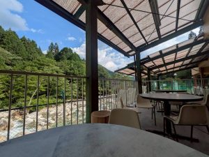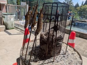 3匹をお願いし、川沿いのテラス??席で焼き上げるの待ち