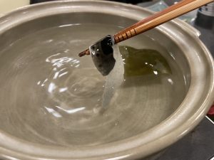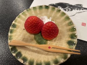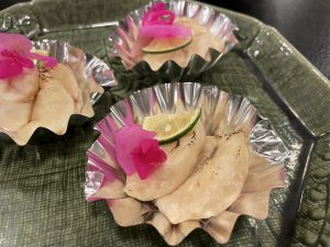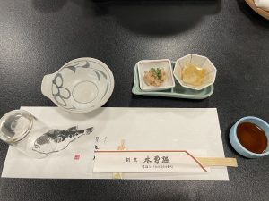 先付けは煮凝りとふぐの塩辛。塩辛は初めて食べたけどとっても美味しく、くせになる味でした。