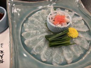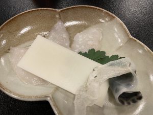 初めて食べたフグのしゃぶしゃぶ。皮はプルンとして食感も良く、身は中はレアで食べるともう絶品!