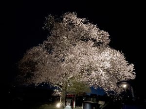 この桜が今ライトアップされてて幻想的な夜桜を見ることが出来る。