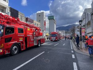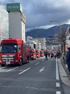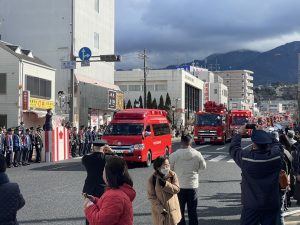 中津川駅前通りにて消防団、消防車の大行進が行われ沿道からも歓声が湧いていました。